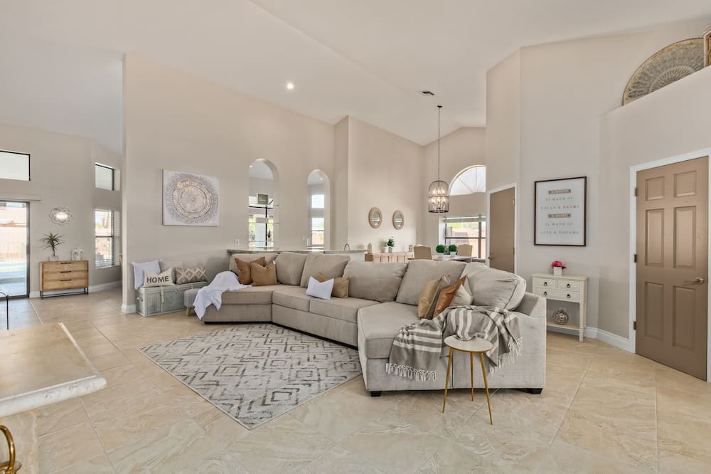 This spacious 4 bedroom, 3 bathroom home blends modern elegance with boho chic. High ceilings,STEAM ROOM SHOWER and pocket doors create an inviting living space, while the outdoor BBQ and fire pits are perfect for enjoying the beautiful Arizona weather. With a heated pool and in-ground trampoline in the large backyard, it provides space.......read more