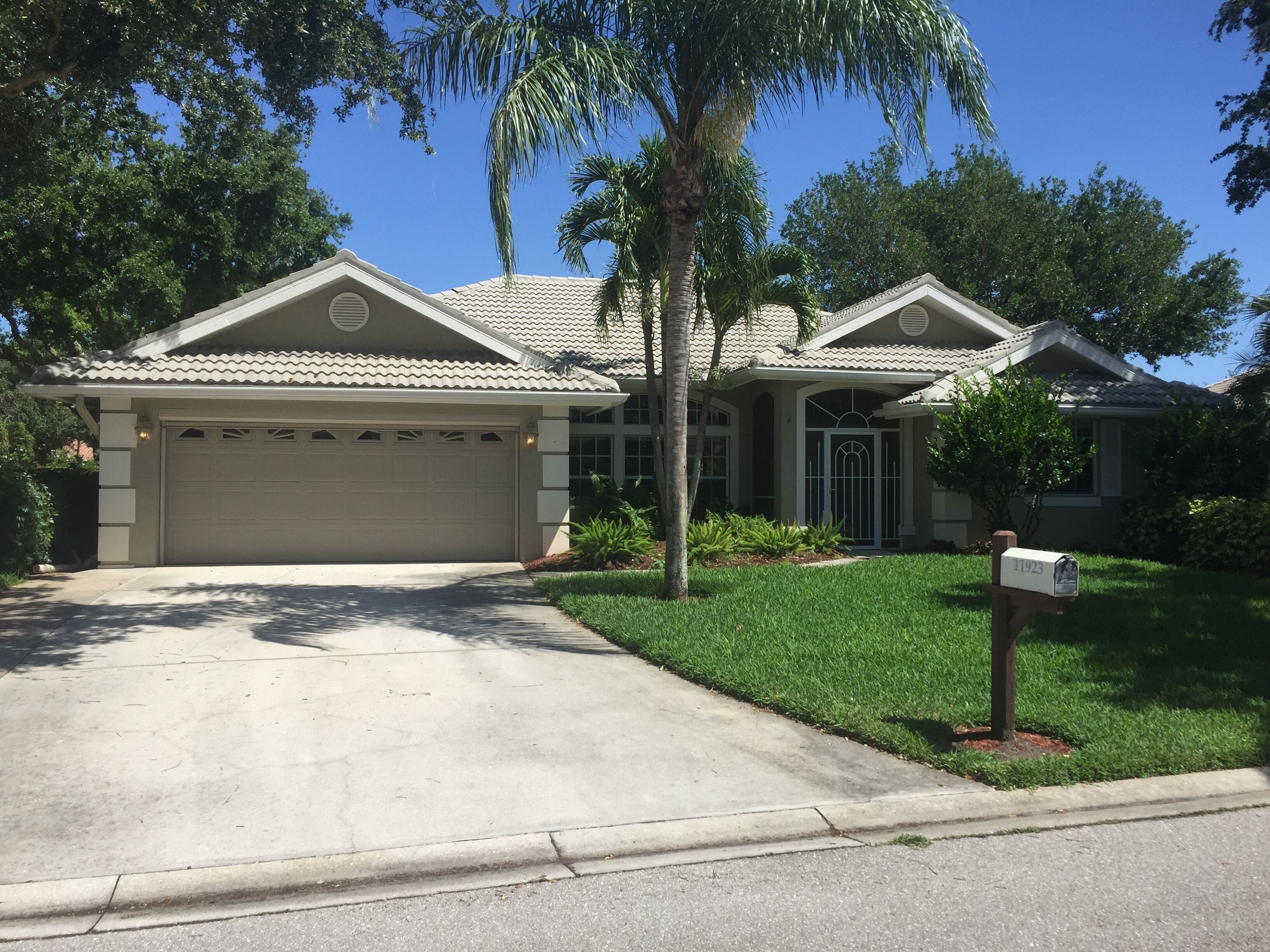 Neighborhood is lined with beautiful oak and palm trees.
